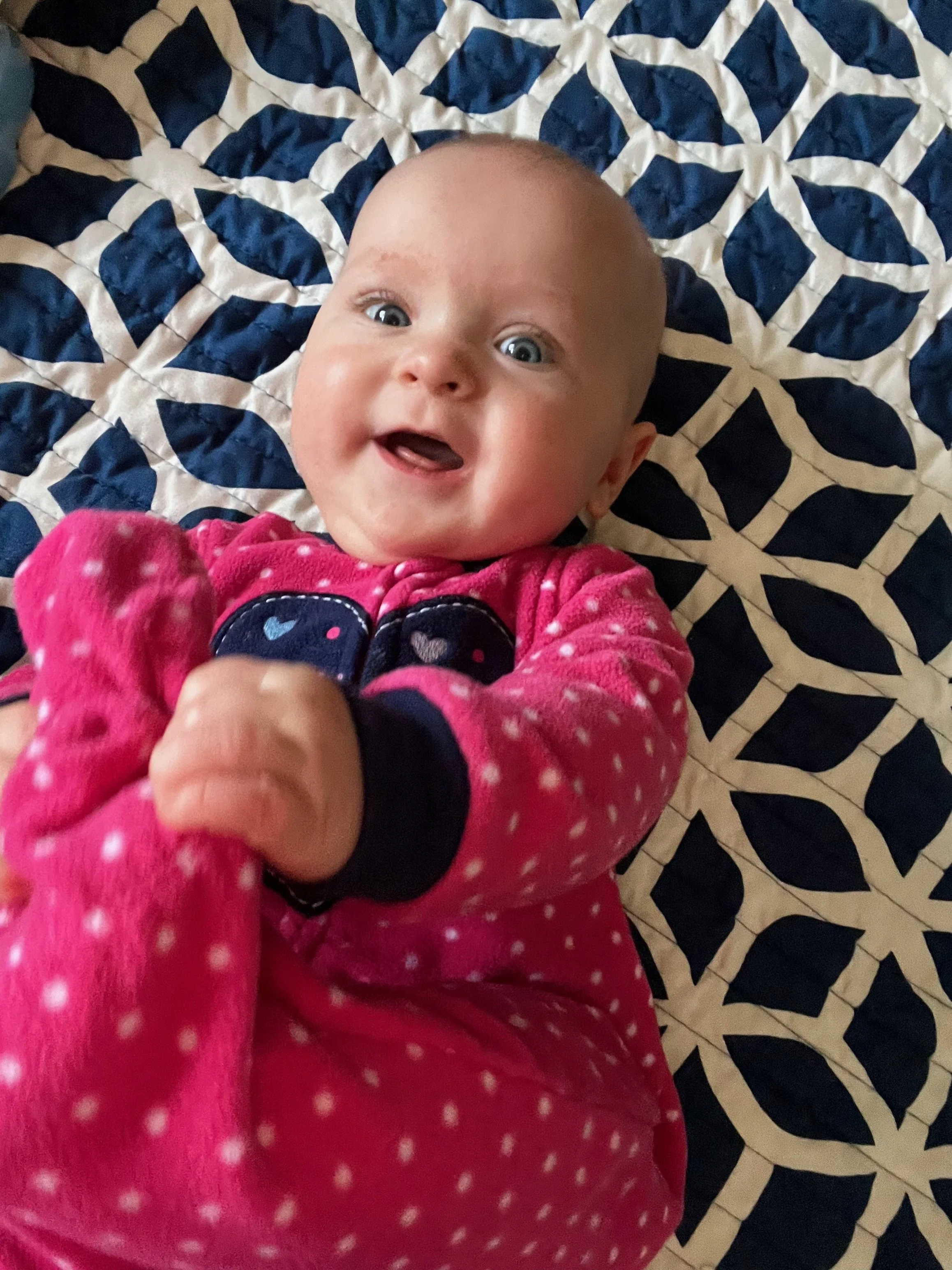 Our baby tucking her bottom arm underneath after tummy time to complete a roll belly to back.